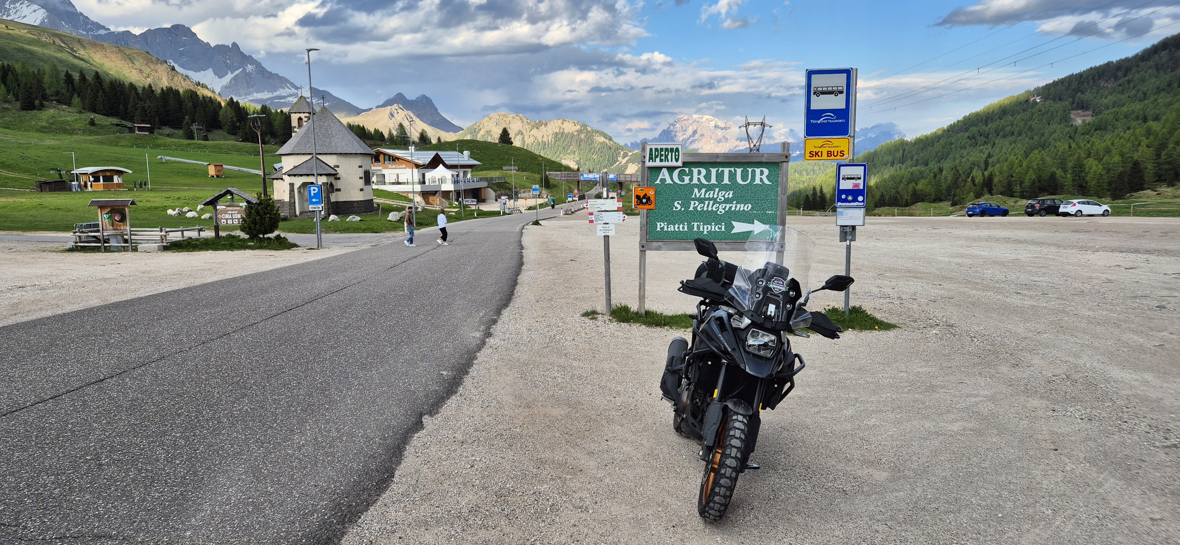 Die rund 21 Kilometer lange Straße über den San Pellegrino ist gut ausgebaut und komplett asphaltiert. Vor allem die Ostrampe ist durchaus kehrenreich. Trotzdem wird sie nur kaum befahren, weil sich die Verkehrsströme der Regionen, die der Pass verbindet, anderweitig orientieren. Dies gilt allerdings nicht im Winter, denn der 1918 Meter hohen Scheitel befindet sich inmitten des Skigebietes Trevalli, das dem Dolomiti Superski angeschlossen ist. Dementsprechend ist die Straße auch ganzjährig befahrbar. Der Name hat übrigens nichts mit dem bekannten Edel-Mineralwasser zu tun, denn deren Quelle befindet sich fast 300 Kilometer entfernt in San Pellegrino Terme in der Lombardei. |