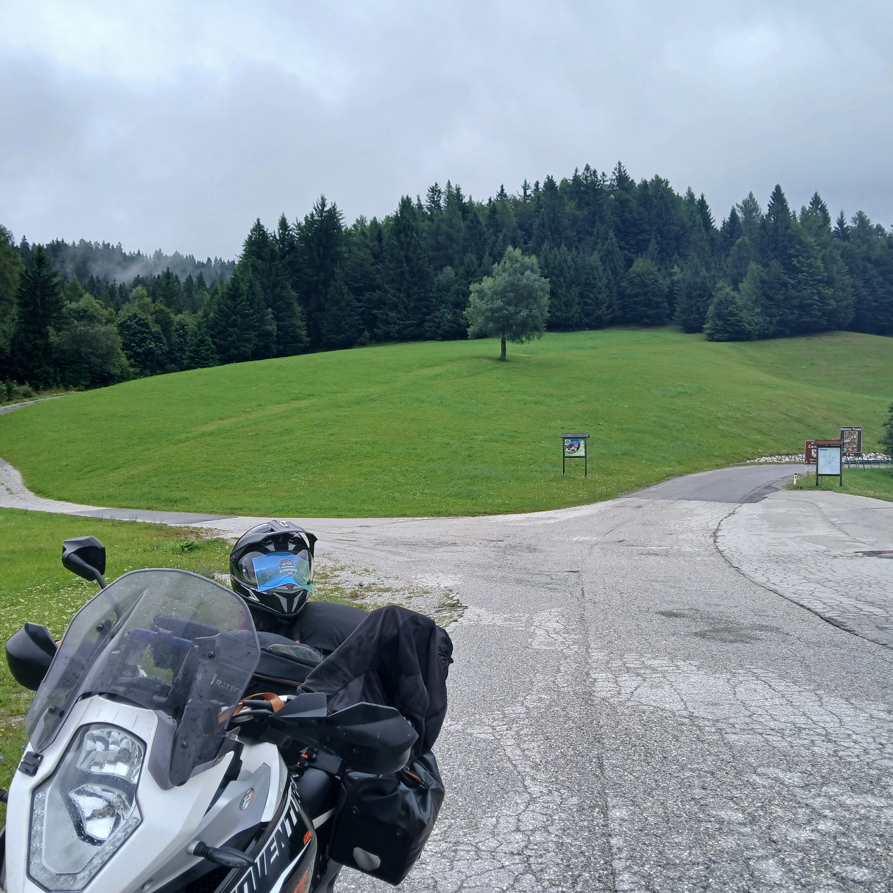 Die 912 führt durchgehend asphaltiert über die Nordrampe fast bis zum Scheitel immer an der Davščica entlang, einem kleinen, wilden Gewässer, dass hier im Gebirge entspringt, Die breite Passhöhe liegt unmittelbar am Skigebiet von Cerkno, das nach einer kurvenreichen, zwölf Kilometer langen Abfahrt Ziel dieser Etappe ist. |