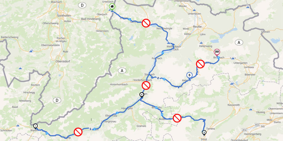 Die Fahrverbote in Tirol für Motorräder mit mehr als 95 dB(A) Standgeräusch bewirken somit, dass auch die Zufahrten aus Deutschland und Voralrberg nach Tirol über das gesamte Lechtal sowie die Routen durchs Namlostal und über das Hahntennjoch für die betroffenen Motorräder gesperrt sind.